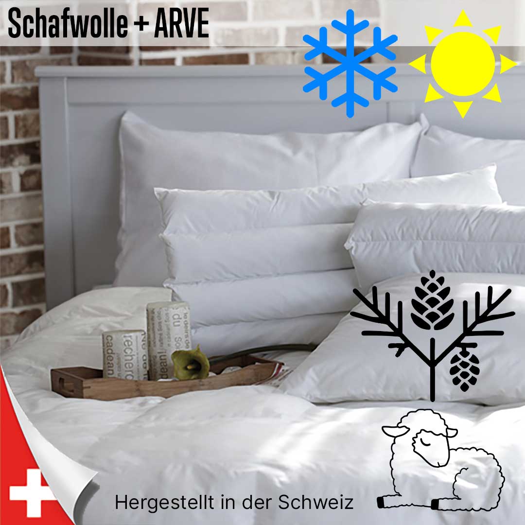 Pure Entspannung mit unserer Ganzjahresdecke mit Arve und Schweizer Schafwolle.